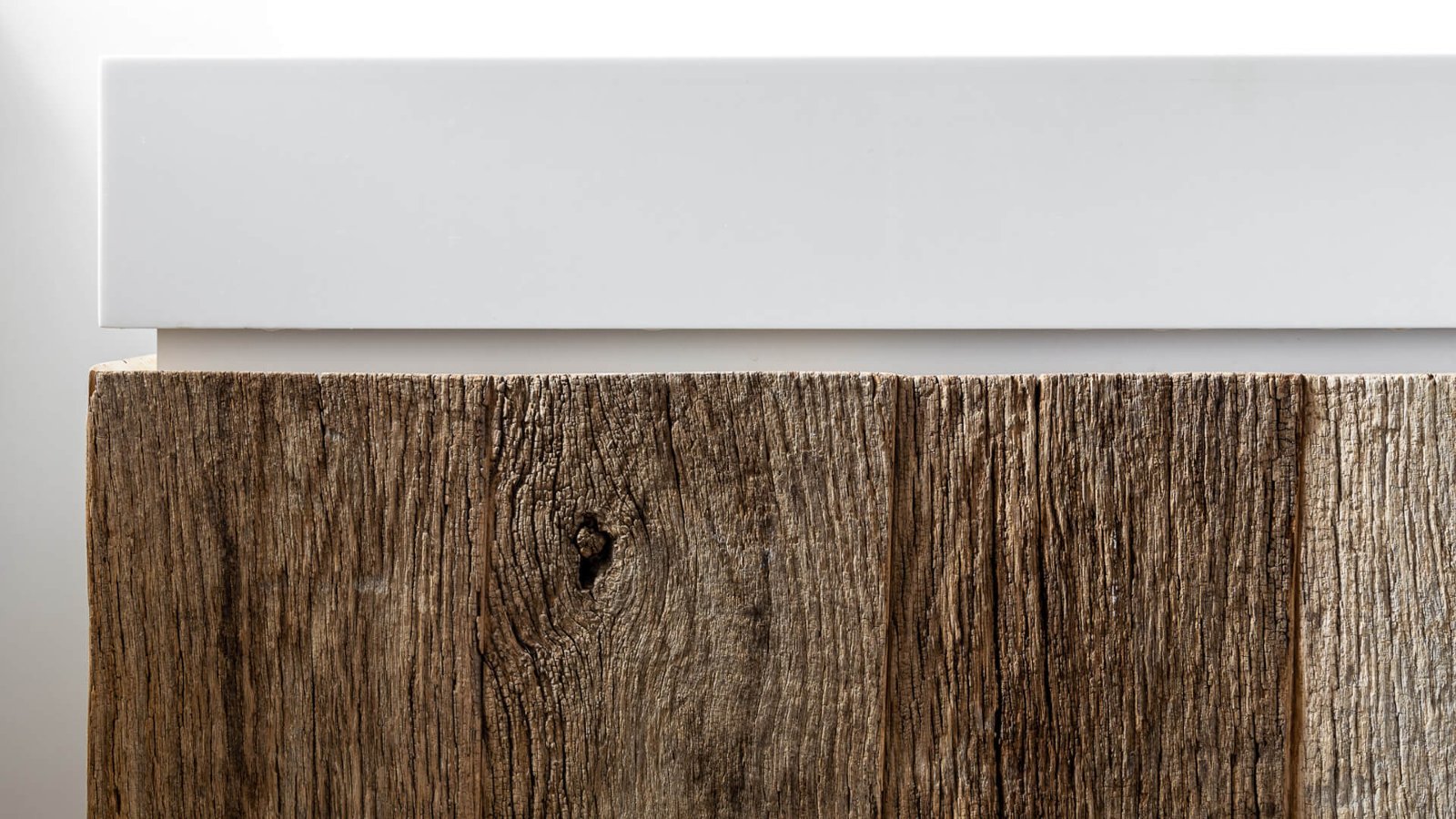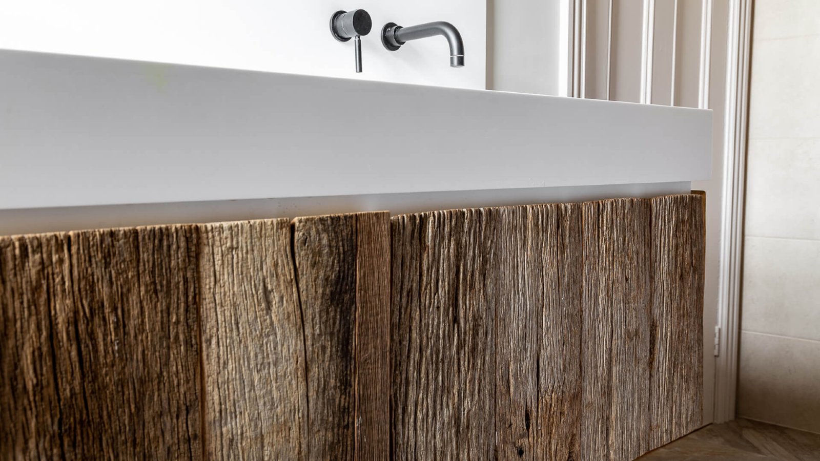 We have been using reclaimed wood for decades in furniture design. Things have moved on a little since we started in the 90’s however! Here a very rustic raw wood vanity drawer unit is made more contemporary with white corian double sinks & matte black taps.