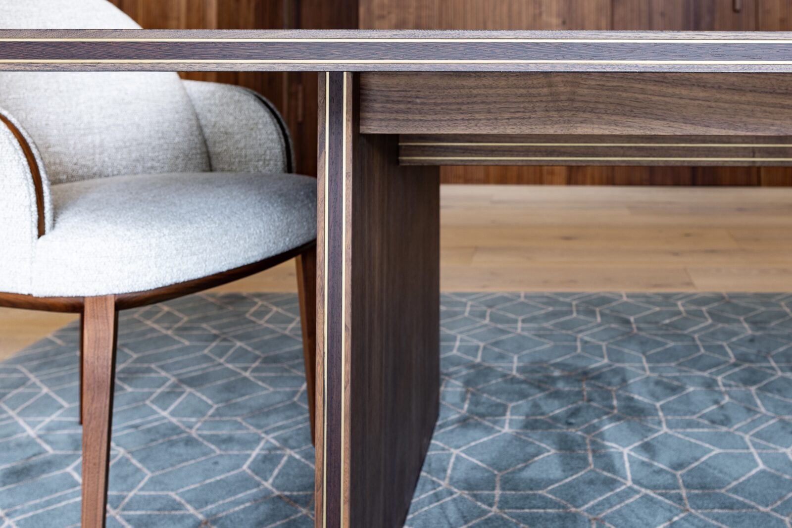 Extendable dining table crafted out of black walnut with solid brass trims.