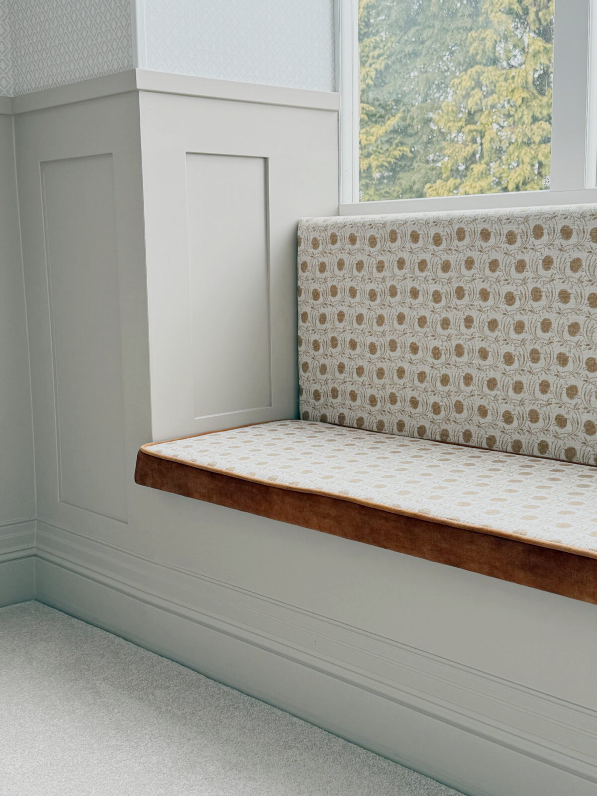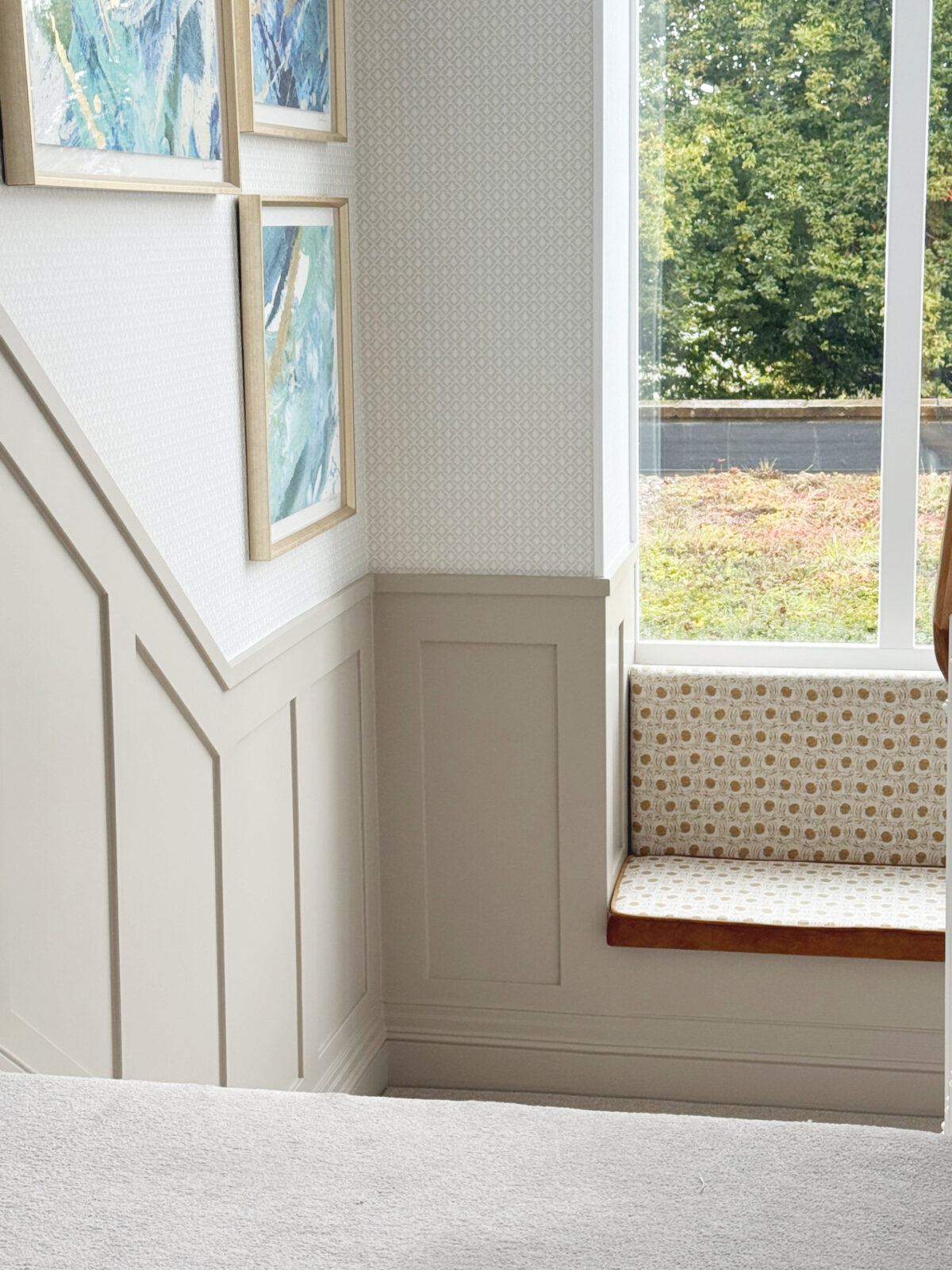Soft, neutral staircase panelling with a built-in, upholstered window seat.